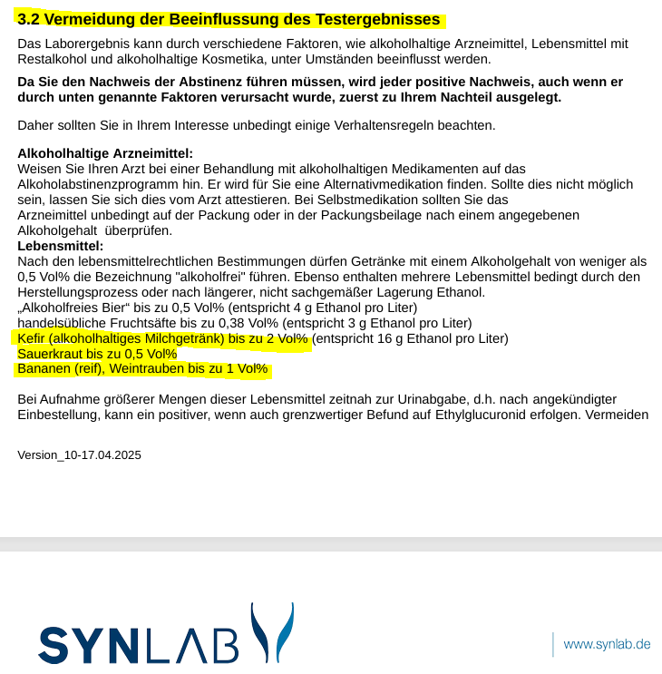 Beim Durchlesen der Unterlagen von Synlab steht, dass auch eine reife Banane zu falschen Ergebnissen führen kann.