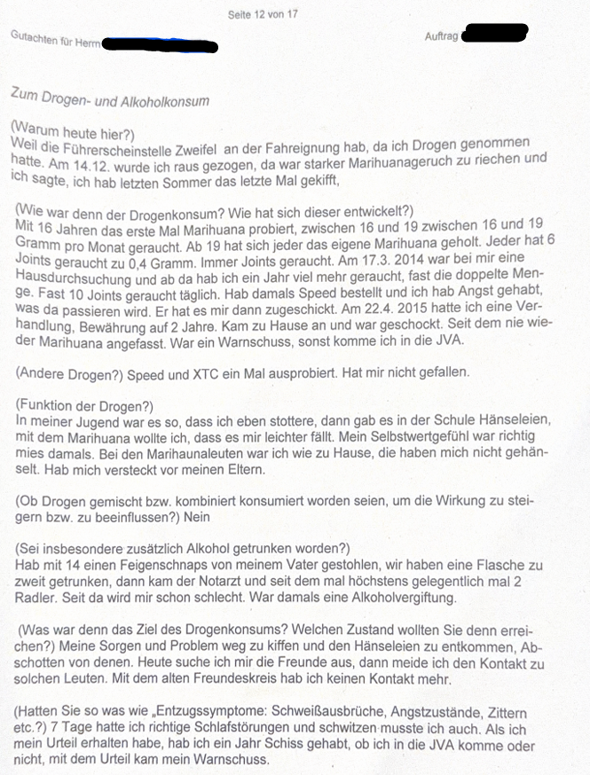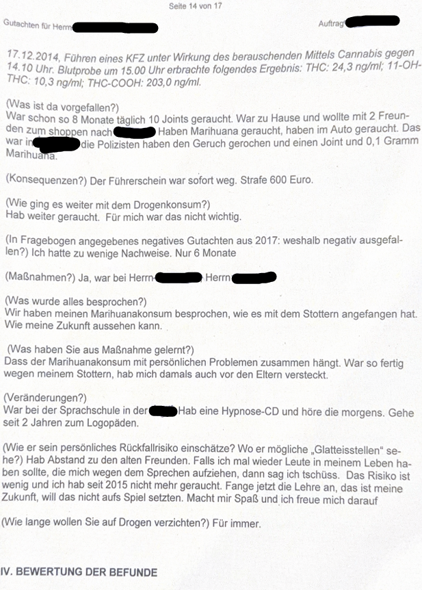 Durch das Rezept vom Arzt für Cannabis, habe ich mich auf der sicheren Seite gesehen um den Führerschein aufgrund des Konsums nicht zu verlieren. Das Rezept habe ich aufgrund des Stotterns und von angegebenen Schlafstörungen bekommen.