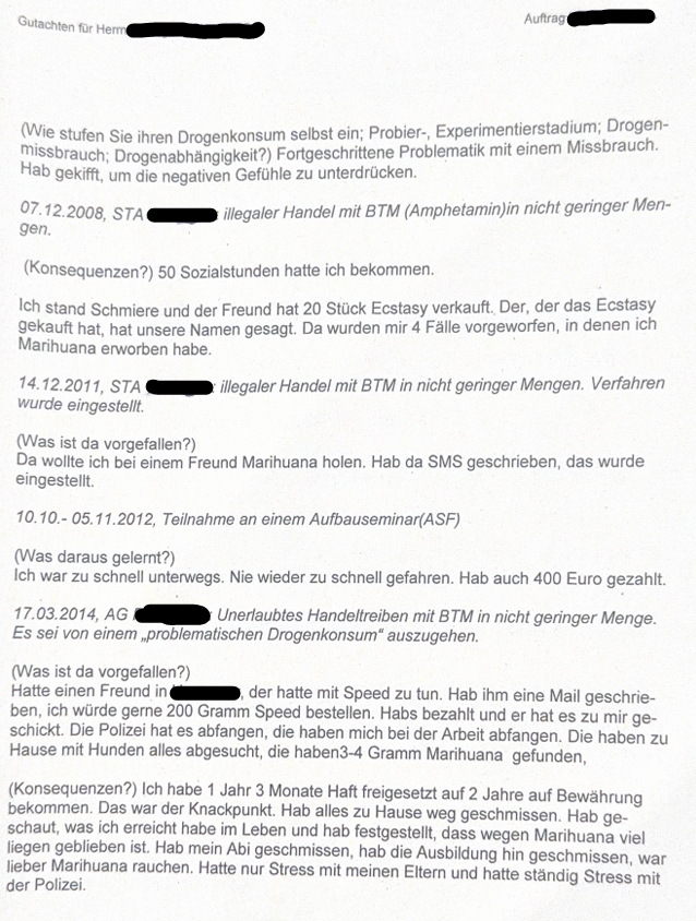 Ich war Cannabis einkaufen da ich um ca. 11 Uhr morgens mein letztes konsumiert hatte. Die Person bei der ich das Cannabis gekauft hatte, war noch nicht daheim und meinte das ich noch 10 min vor seinem Haus auf ihn warten sollte. Dabei saß ich im Auto, hatte den Motor laufen und das Licht von automatisch auf aus gestellt. Als der Handel abgeschlossen war bin ich dann wieder in mein Auto und habe beim losfahren das Licht nicht mehr angeschaltet, es war schon dunkel (23:45 Uhr) . Bin dann circa 2 km weit gekommen und wurde dann von einer Streife raus gezogen, da ich ohne Licht unterwegs war. Im Fahrzeug wurde dann starker Cannabis Geruch wahrgenommen und ich musste mit ins Krankenhaus für eine Blutprobe da ich die UK zuerst verweigert hatte. Im Krankenhaus habe ich dann gefragt ob ich kurz aufs Klo könnte da wir ziemlich lange auf den Arzt warten mussten, dabei wurde dann die UK gemacht und Cannabis und Kokain festgestellt.