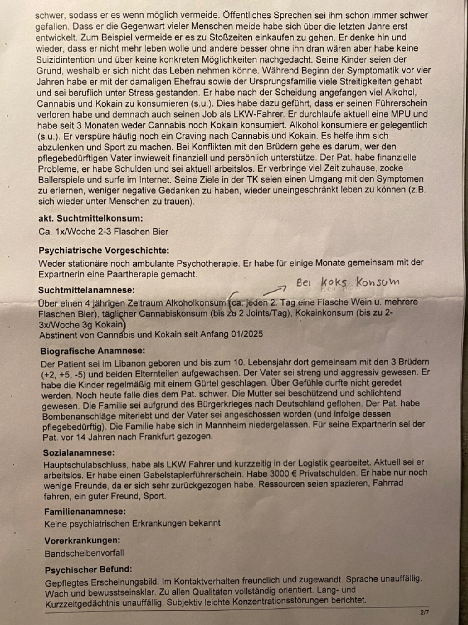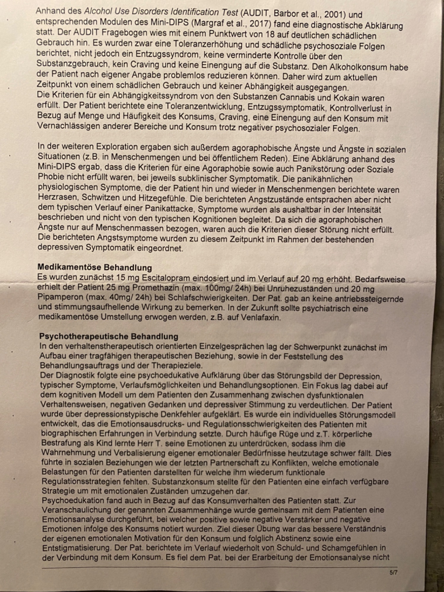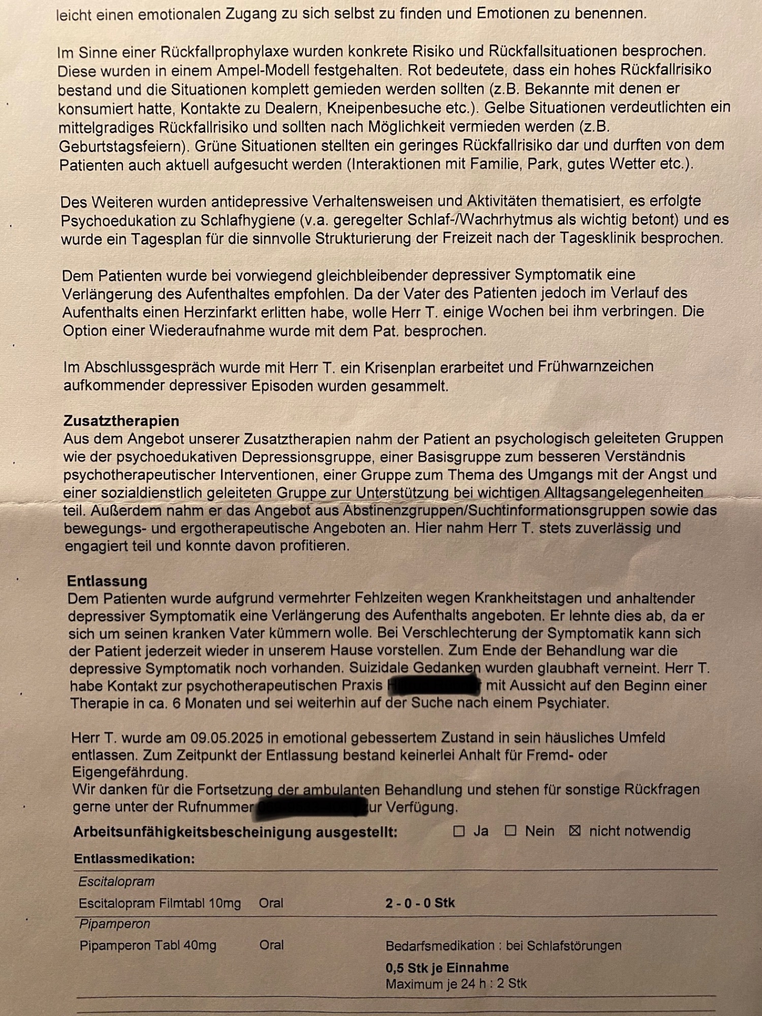 Ich werde mir Mühe geben das zu schaffen. mit eure Hilfe habe ich ein guter Ratgeber an der Seite :) habe hier mein vorläufiger Entlassungs Brief gefunden das sind 7 Seiten. Gibt es was was ihr nicht unbedingt lesen müsst? Das ist der Brief von psychiatrische Tagesklinik. Kann ich das morgen Einfach abfotografieren und hochladen? Natürlich anonym unkenntlich gemacht.