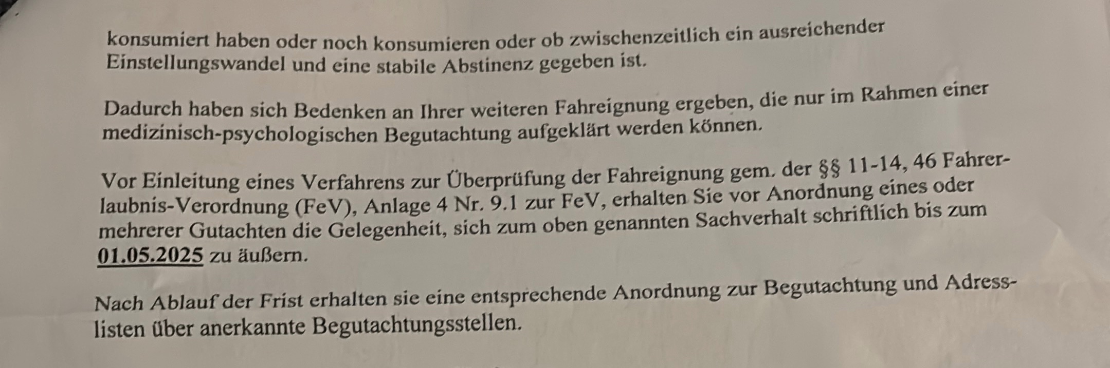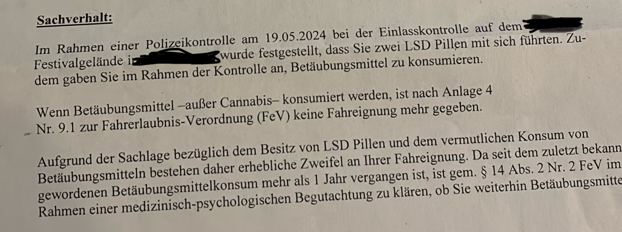 Hallo, ich wurde letztes Jahr am Eingang beim einem Festival mit zwei Micro LSD Derviaten erwischt. Leider hatte ich an dem Abend zugegeben, dass ich dies an dem Tag konsumiert hatte, zwecks Eigentherapie gegen Depressionen, also nicht um Party zu machen oder sonst was. War zum ersten Mal da ausprobiert. Es war sehr spät und ich war übermüdet. Sie haben da auch keine Test mit mir gemacht, also kein Urin Test oder Blutabnahme, wo sie das hätten nachweisen können. Nach knapp einem Jahr kam die Führerscheinstelle mit MPU. Hatte bis vor kurzem Zeit gehabt mich zu „rechtfertigen“, tat ich aber nicht. Warte jetzt noch auf einen weiteren Brief für die Termine für die psychologischen und medizinischen Gutachten. Mir wurde von einem Anwalt gesagt, dass sie 100% eine haarprobe möchten. Mein Problem, ich färbe schon sehr lange regelmäßig meine Haare rötlich. Da ich von Natur aus sehr dunkle Haare habe, muss ich sie ja blondieren. Da ich anfangs aber nicht wusste, dass sie davon einen Nachweis möchten bzw. dass da überhaupt noch was kommt habe ich ein Problem. Viele meinten, dass es denen egal ist, weil es als Täuschungsversuch gewertet wird. Ich hatte mit sowas noch nie zu tun und weiß nicht, wie ich das handhaben muss. Brauch meinen Führerschein wegen der Arbeit. Bin an dem Tag bzw Tage danach auch kein Auto gefahren. Hat hier jemand Ahnung davon?