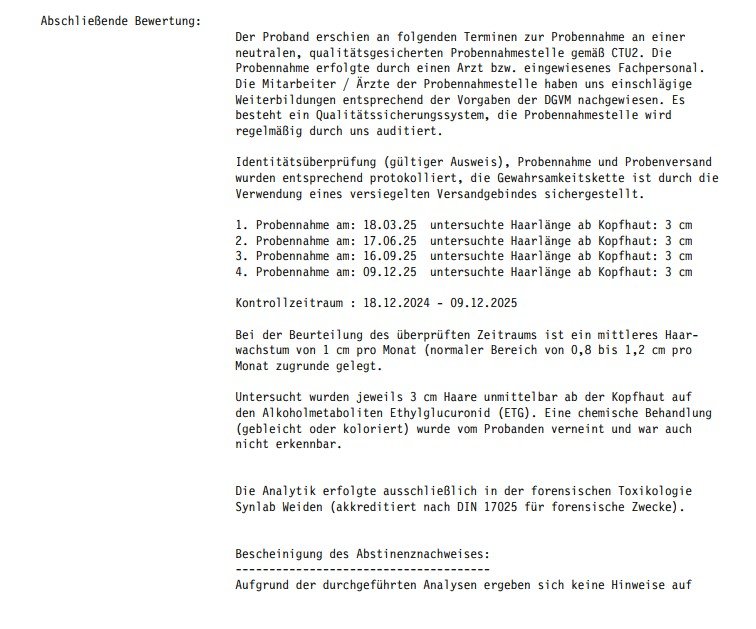 dem kann ich mit Sicherheit Widersprechen. Ich hatte einen 12 Monatsvertrag auf Haaranalyse und ich habe auch die 12 Monate als Abstinent bestätigt bekommen mit Endergebnis