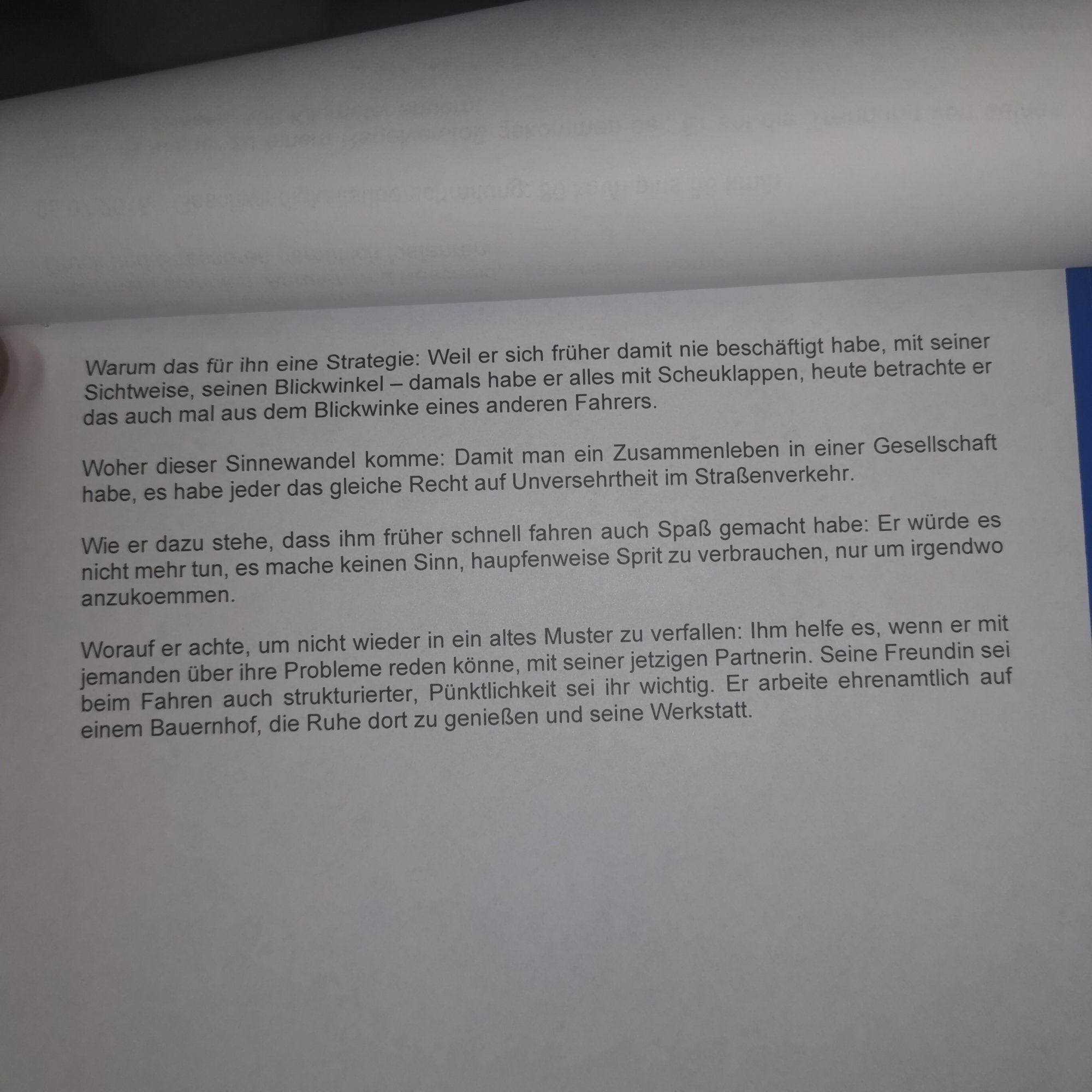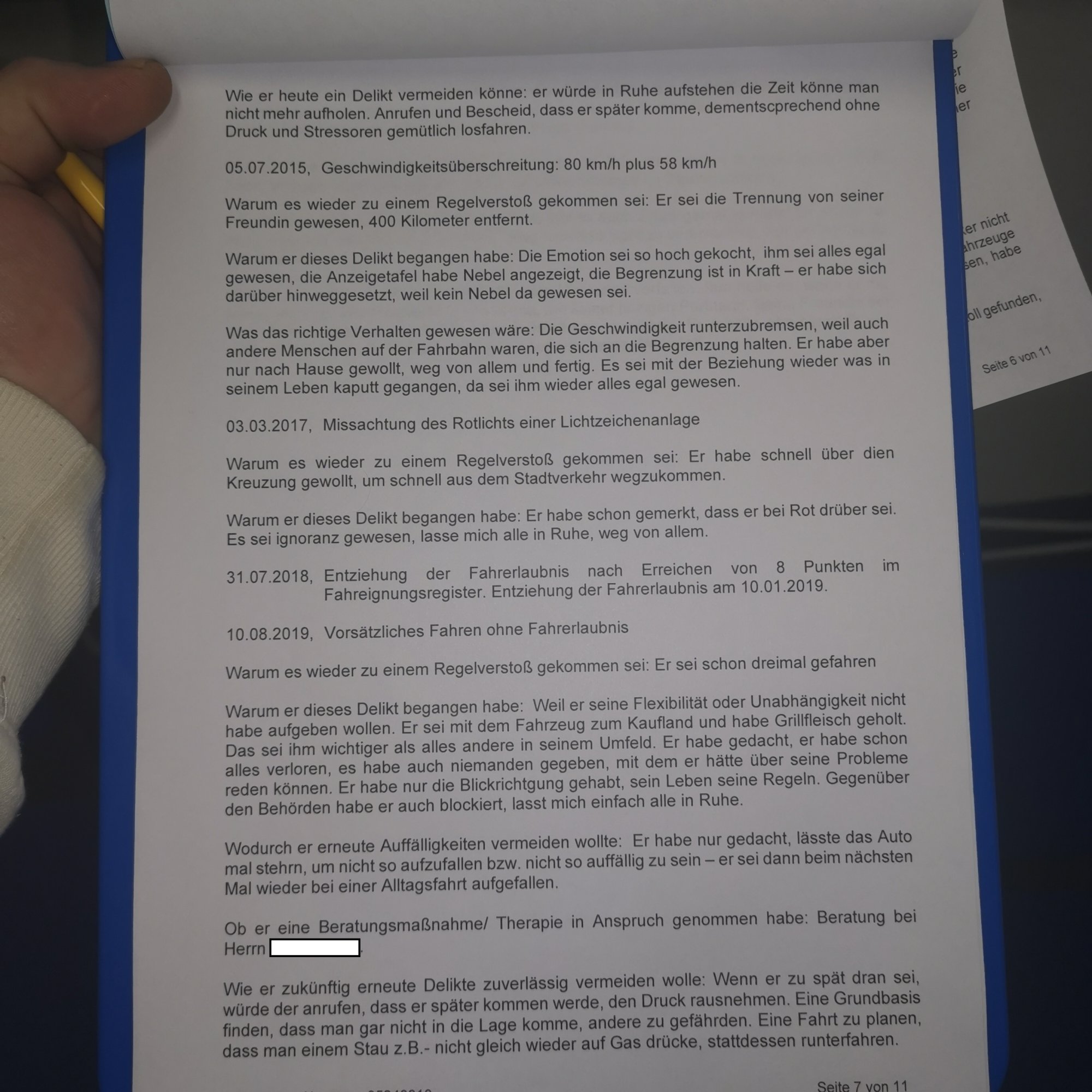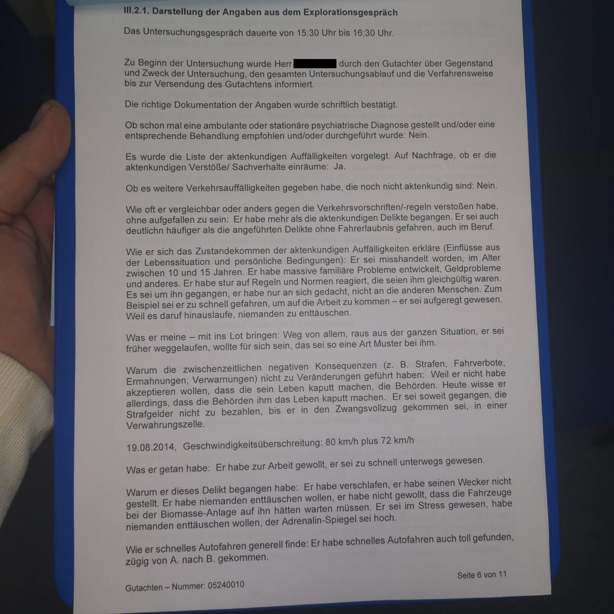 Mahlzeit, ich gebe euch mal die Urschrift meines 6ten MPU protokolls vom 07.02.2024