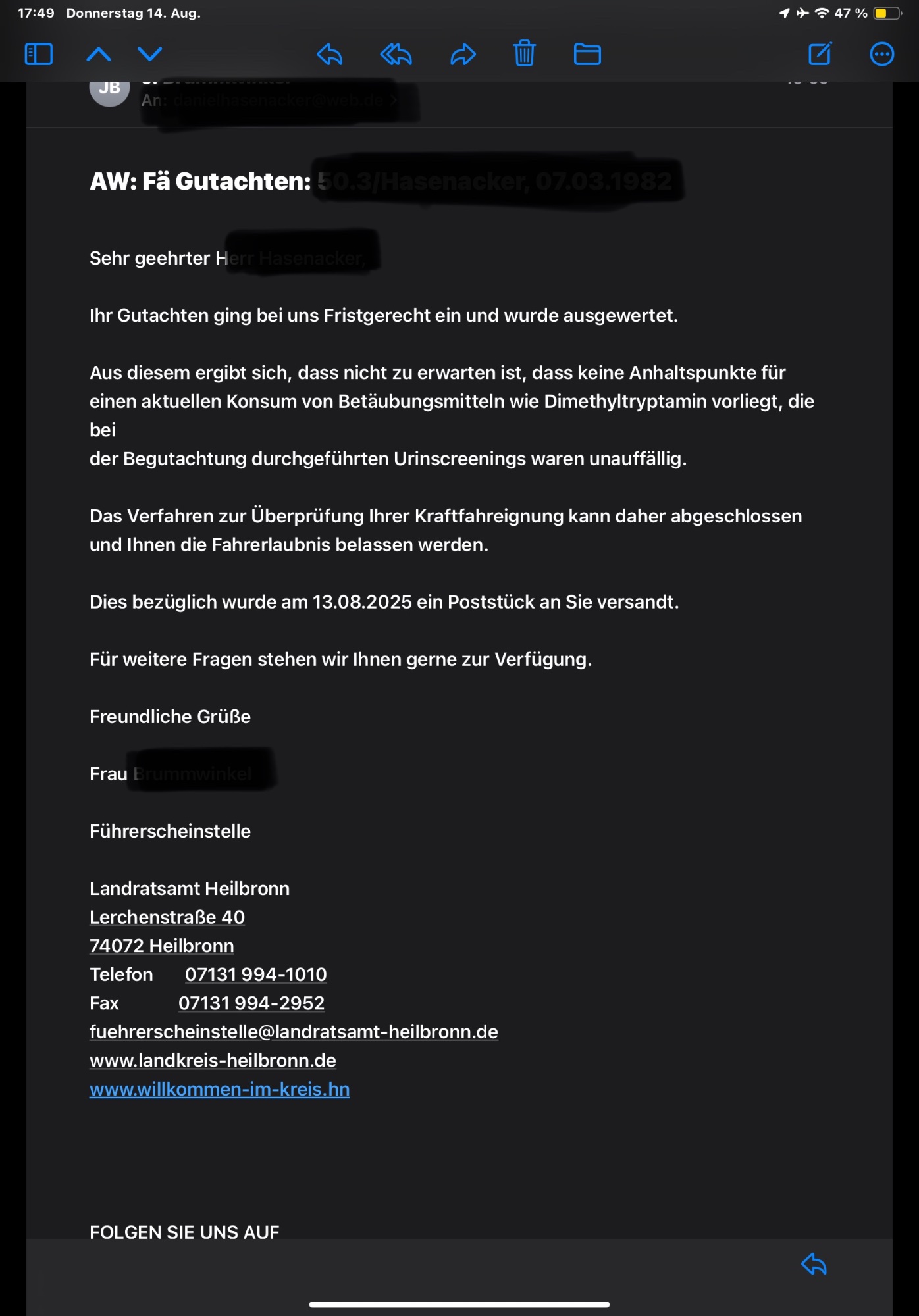 Meiner Meinung nach ist das Gutachten weder eindeutig negativ noch eindeutig positiv. Eher nach dem Motto: Die Story von MaxG ist aus Sicht der Ärztin kritisch zu bewerten, soll sich die Führerscheinstelle damit rumärgern.