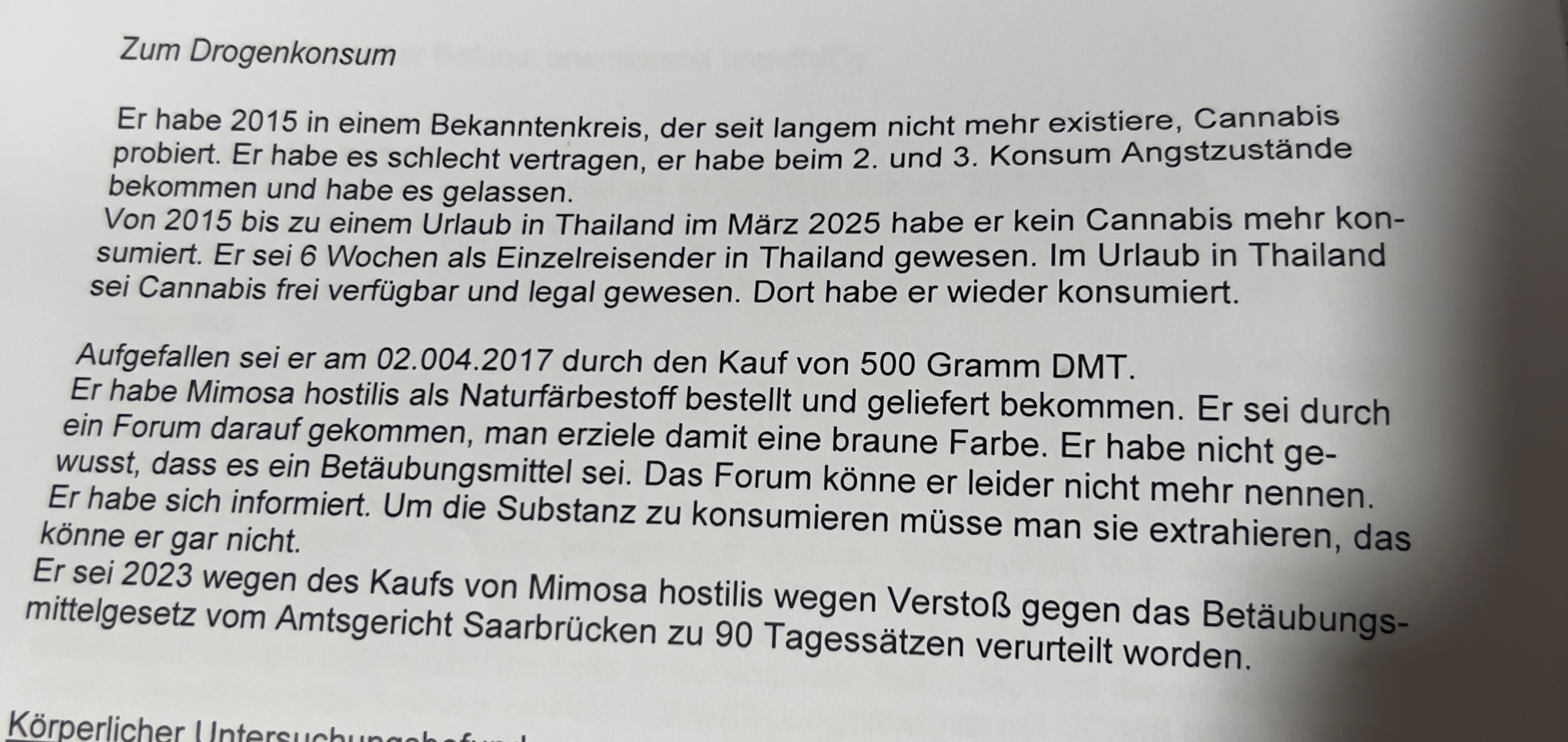 ich lese da auch Einiges an "naja naja" raus. Die ärztliche rein körperliche und chemische Befundlage ist klar, aber das "drumrum" lese ich durchaus als zumindest skeptisch. Da schreien Fragen raus, z.B. wie kann es sein, dass nach diesen berichteten schlechten Erfahrungen wieder konsumiert wird? Das in Verbindung mit "ich bestelle potentielle Betäubungsmittel zum Färben, weil das in einem (unbekannten) Forum geschrieben wurde" wirkt ziemlich fadenscheinig, zudem weiss er, dass man diese Substanzen ja extrahieren könne (und es fehlt halt nur die Ausrüstung, so die Behauptung). Wieso interessiert sich jemand, der "nur färben möchte", für weitere Einsatzzwecke?