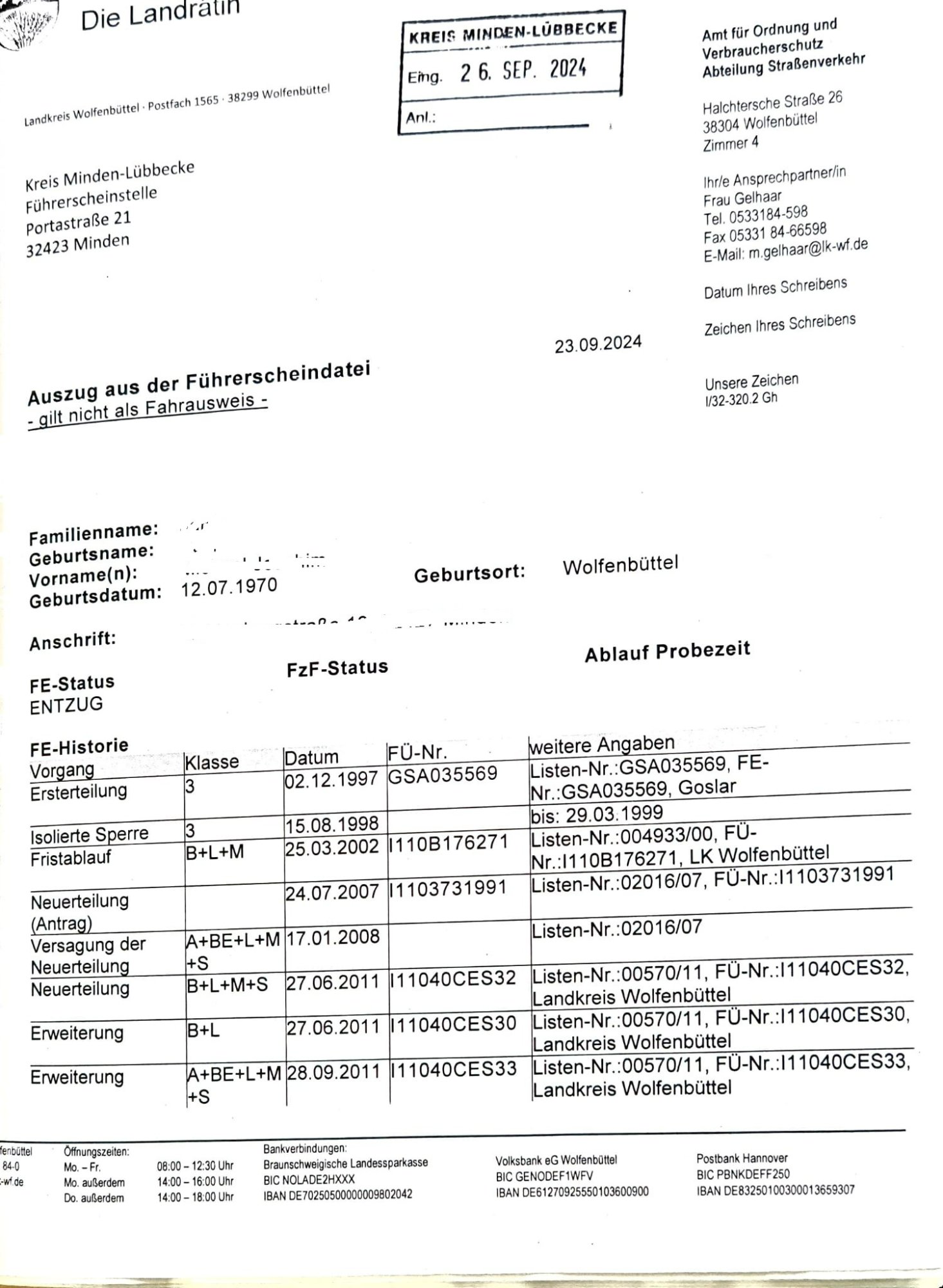 ich war heute beim strassenverkehrsamt. das ist die ausbeute. meine erste mpu war im feb.2011 also ist die im märz 2026 aus denn akten.
