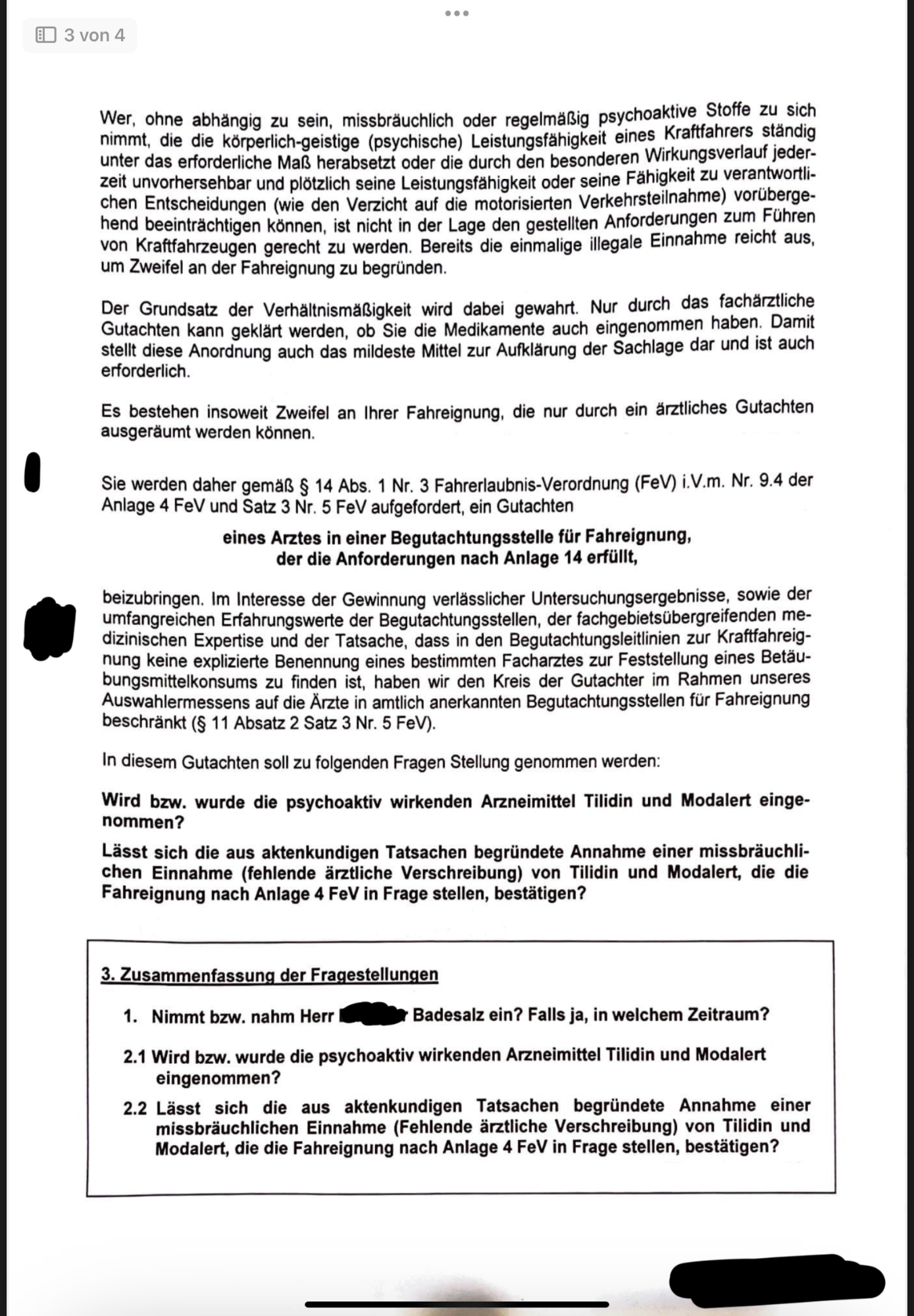 Mir wurde von der FS-Stelle am Telefon gesagt, dass ich eine MPU absolvieren muss, falls das Gutachten bestätigt, dass ich Tilldidin/Modalert/Badesalze konsumiert habe.