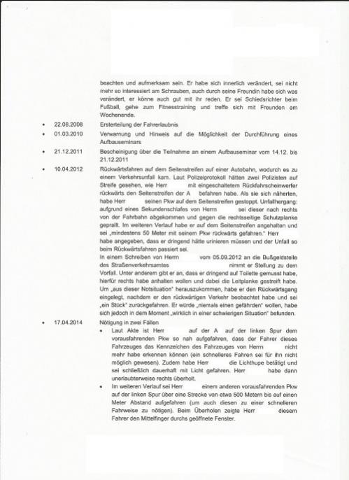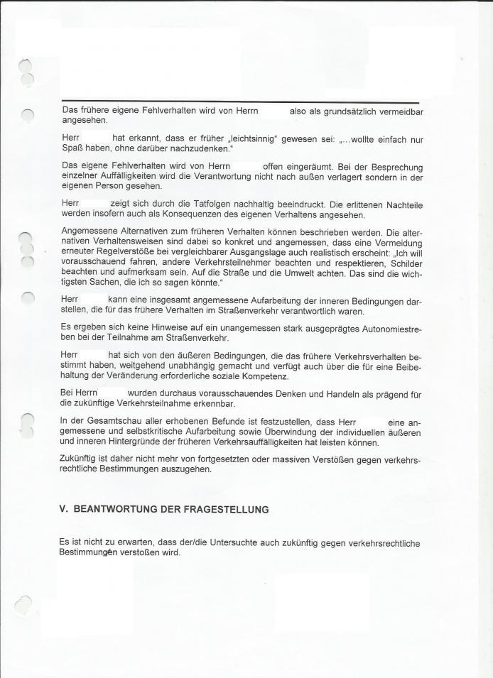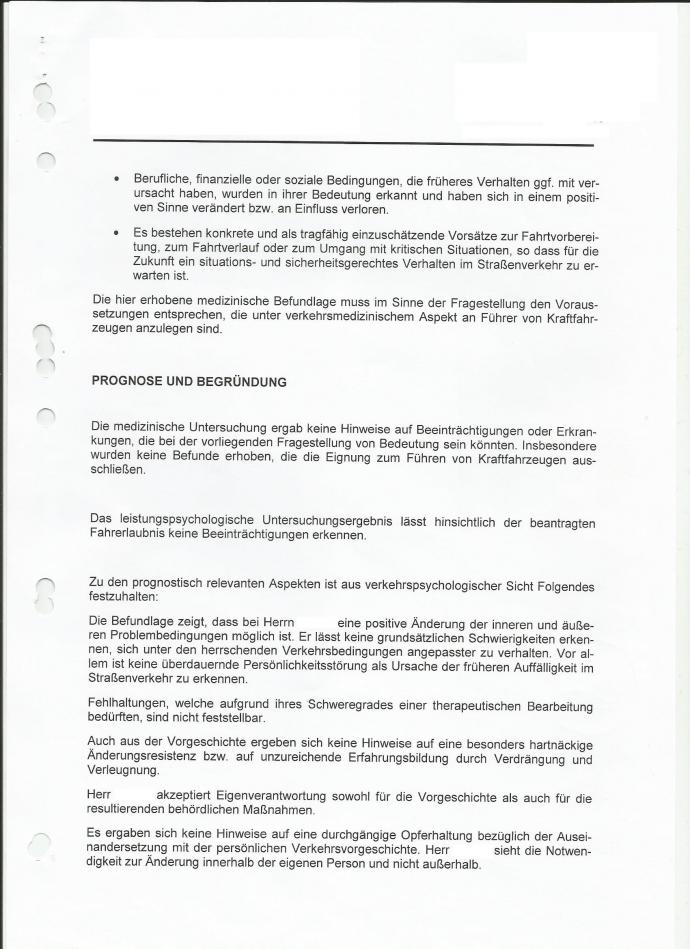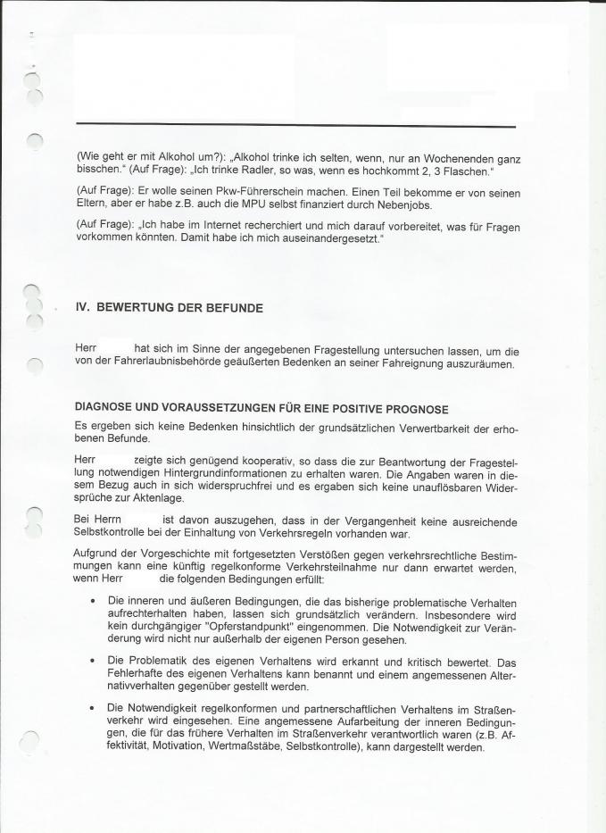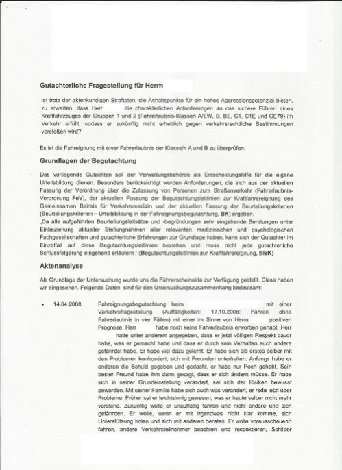 so, nun habe ich die Fragen größtenteils beantwortet. Anbei habe ich 4 Dokumente vom negativen Gutachten eingefügt, die ersten Beiden Dokumente beinhalten die "Gutachterliche Fragestellung" und die Vergehen, die ich begannen habe.