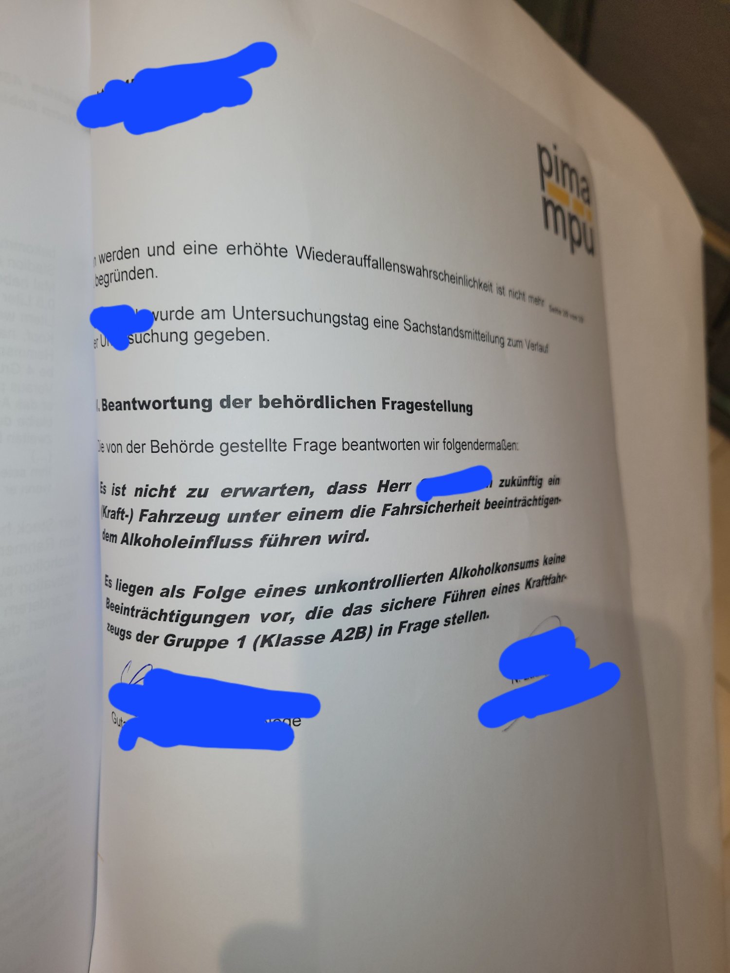 Heute Mittag um 14:00 Uhr einen kurzfristigen Termin bekommen, drückt mir die Daumen ...mein VP meinte den "Abstinenznachweis" soll ich nicht abgeben, ich verstehe sein Problem dabei aber ehrlich gesagt nicht..auf dem Befund steht nirgends drauf das mein letzter Alkoholkonsum der 16.4. , also gibt es doch da eigentlich kein Problem?