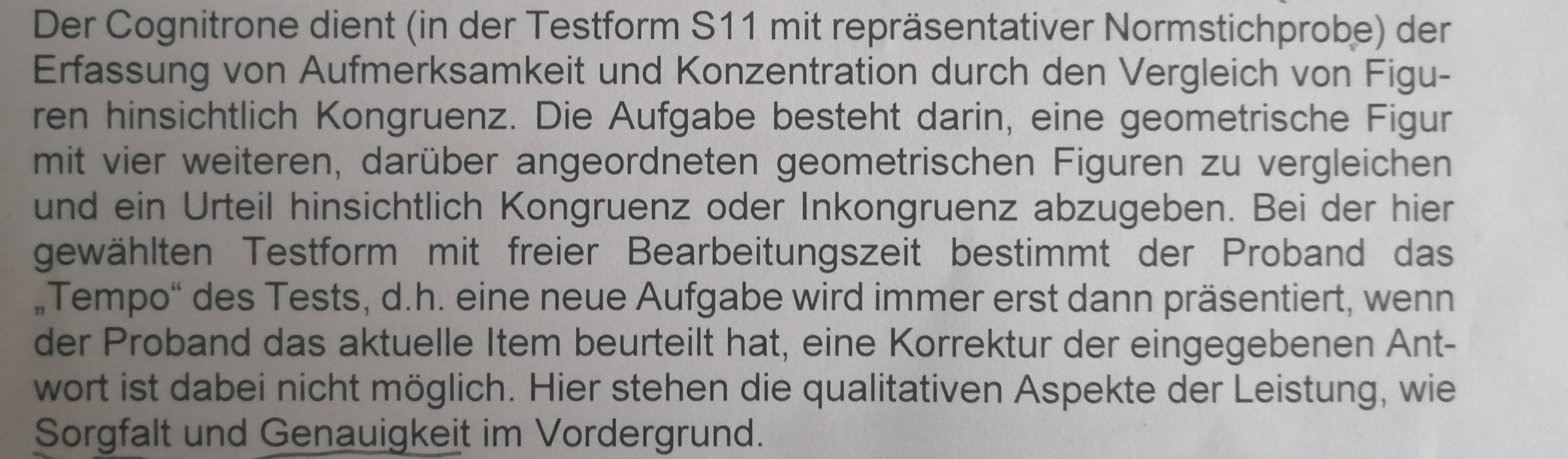 Man muss dazu sagen, dass es verschiedene Versionen des Cognitronentests gibt, zb. die Testformen COG S1-S3, S8-S9 und S11 sind so konzipiert, dass die Bearbeitungszeit nicht fest ist, also eine freie Bearbeitungszeit beinhalten.