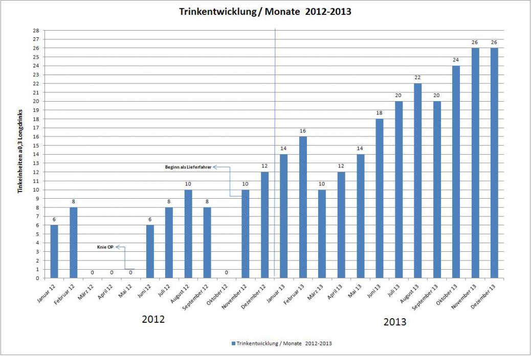 Habe Ihr dann mein Trinkkalender gezeigt 2012 bis zur TF 2014, wo Sie erstmals schockiert war und gleich zugab sowas noch nie gesehen zu haben, und Sie nicht wüsste was TE sind. Habe Ihr dann das mit TE erklärt, dass eine TE 0,1 Promille entspricht z.B. 0,2 cl Schnaps. Sie war ehrlich gesagt nicht so begeistert von der Statistik mit der TE, weil Sie meint damit stellt man sich negativ dar beim GA und zeigt, dass man erheblich ein Alkoholproblem hat. Ich habe Ihr dann erklärt, dass dieser Kalender ja zeigt wie es vor meinen Alkoholmissbrauch war und es langsam Anstieg, aufgrund meiner Verletzung mit OP zufolge und die Problemverdrängung. Und ich damit ja zeigen will, dass ich mich mit der Vergangenheit auseinander gesetzt habe und es auf Papier bringe. Kurz und knapp Sie meint sowas würde mich nur minus Punkte bringen.