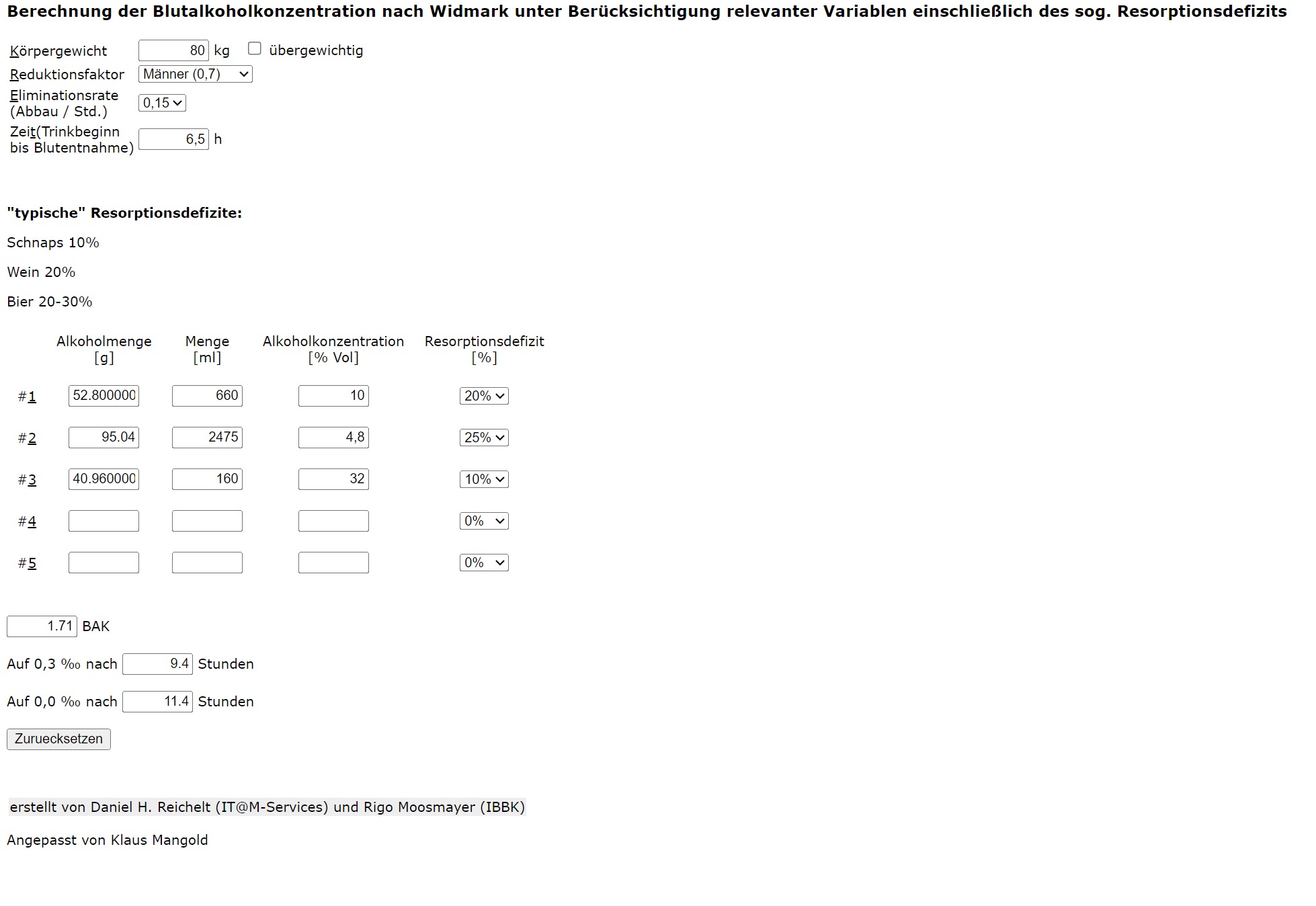 ... hier hatte ich meine Werte auch nochmals eingegeben (unsicher war ich mir nur bei dem Resorptionsdefizit von Gin, ich hatte es mal mit 20% angenommen). Ich komme hier mit den 2 Dosen Gin-Tonic, den 7,5 Bier und den 4 Korn-Cola ziemlich nah an meine Werte: