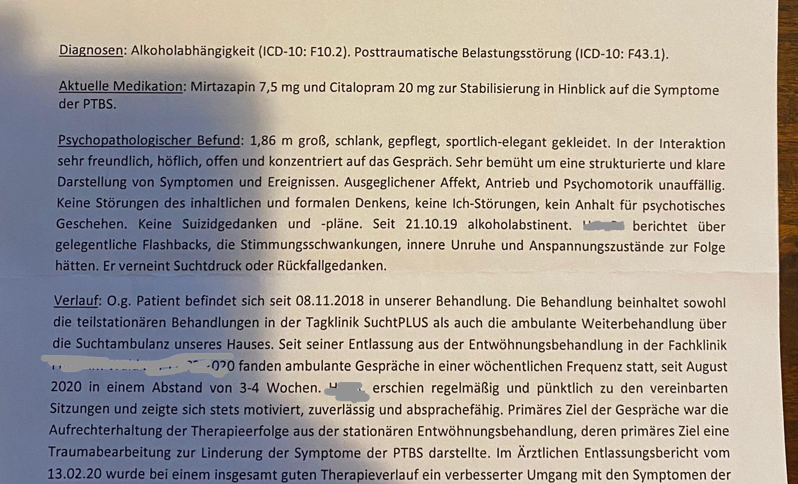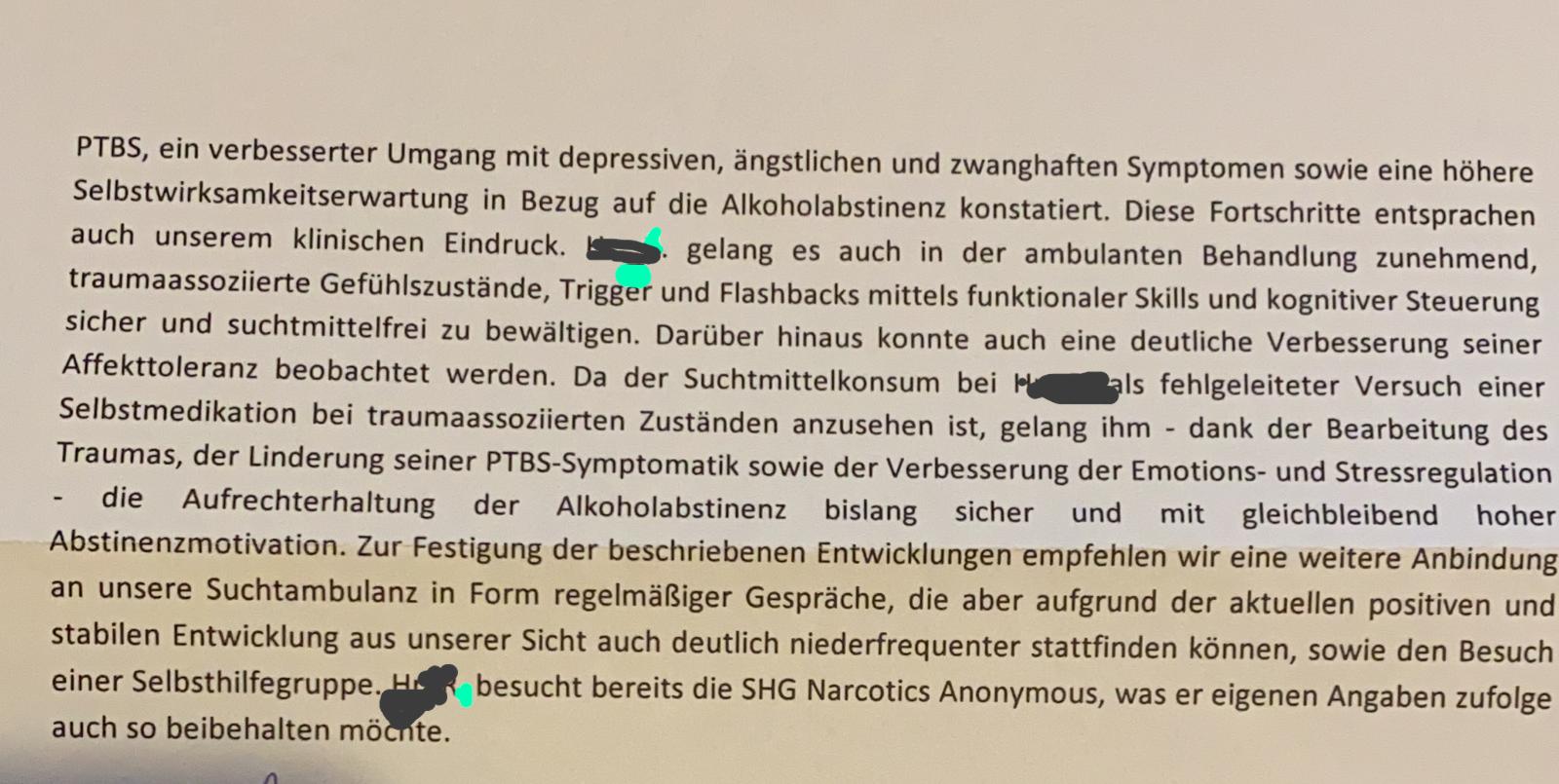 Und dann gab es noch das ärztliche Gutachten von 2017 bei dem ich auch versuchte meinen Alkoholkonsum schön zu reden. Im Nachhinein bin ich froh, das die Ärztin mich so explizit darauf mein Alkoholproblem aufmerksam gemacht hat. Schön langsam beginn ich zu kapieren, dass ich ein Problem hatte
